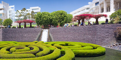 The beautiful Central Garden in the heart of the Getty Center was designed by artist Robert Irwin. A path leads visitors through the garden and follows a water course that eventually runs into a basin with a maze of azaleas. Along the way, listen to the changing sounds of the water: the stones in the water have been carefully placed to create various sound effects. The plants along the water were also specifically chosen for their texture and colour.